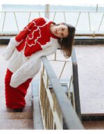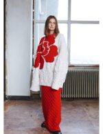 The bold peony motif, rendered in vibrant red against black tones, draws inspiration from Romanian folklore, where the flower symbolizes beauty, resilience, and the blossoming of the spirit. Each petal is integrated into the garment through intricate textural work, making the peony feel alive within the knit.
