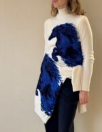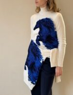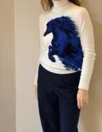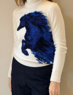 The striking horse motif is created using the intarsia technique, allowing rich color contrasts and precise detailing to emerge seamlessly from the knit. Set against a vibrant background, the design evokes energy, freedom, and quiet power — a statement piece that remains refined and wearable.