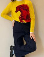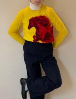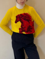 The striking horse motif is created using the intarsia technique, allowing rich color contrasts and precise detailing to emerge seamlessly from the knit. Set against a vibrant background, the design evokes energy, freedom, and quiet power — a statement piece that remains refined and wearable.