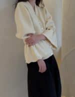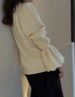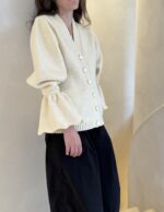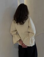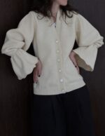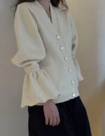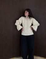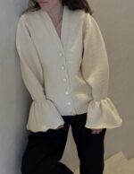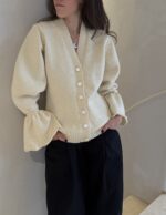 The Lily of the Valley Jacket features gracefully flared sleeves that resemble the delicate, bell-shaped blossoms of the lily of the valley flower, adding a romantic and sculptural touch. Just as the blooms hang softly from their stems, the sleeves fall with a gentle, sculptural drape, evoking the same sense of elegance and natural beauty. The design is completed with delicate knit detailing and refined buttons, showcasing a blend of comfort, craftsmanship, and timeless femininity.